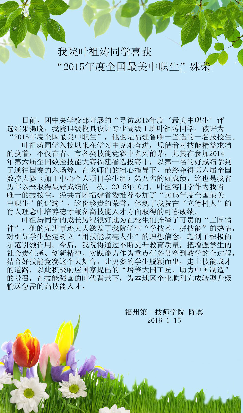 我院叶祖涛同学喜获“2015年度全国最美中职生”殊荣
