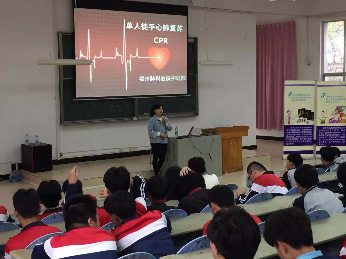 本次讲座我们邀请到了福州肺科医院的8位专家,讲座中专家耐心的介绍了秋季常见传染病的种类及防治方式,同时也对于校内可能使用到的安全急救知识做了详细的普及。现场模拟急救训练让学生们收获满满。