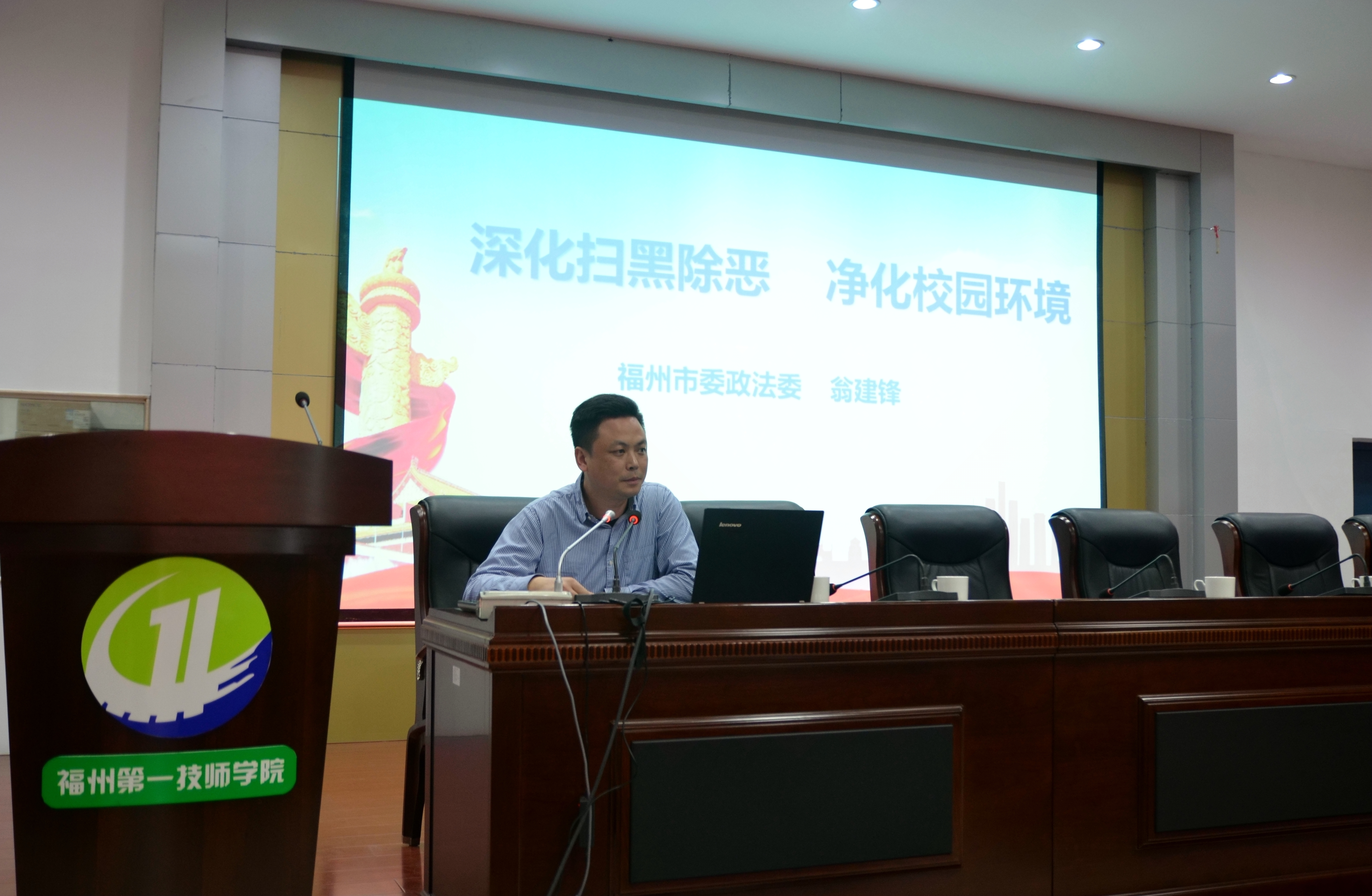 为进一步建设更高水平“平安校园”和深入推进“忠诚保平安,利剑除黑恶”扫黑除恶专项斗争工作,提高全院师生的法律意识和法律素质,推动学院法制教育的深入开展,3月20日下午,学院邀请福州市委政法委综治二处翁建锋处长和福州市公安局台江分局刑侦大队诈骗犯罪侦查队黄秋荣队长为全院师生做“深化扫黑除恶 净化校园环境”为主题的法制报告。