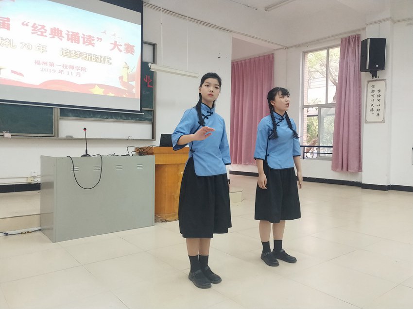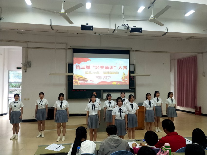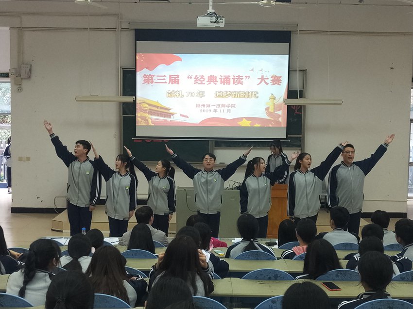 11月6日晚上,为深入开展第二批“不忘初心、牢记使命”主题教育,抒发我院学生爱党爱国的崇高情怀,展示技工院校学生担当奉献的时代风采,院学生处、团委在道德讲堂举办第三届“经典诵读”大赛,共有2018和2019级40组学生参加了此次比赛。